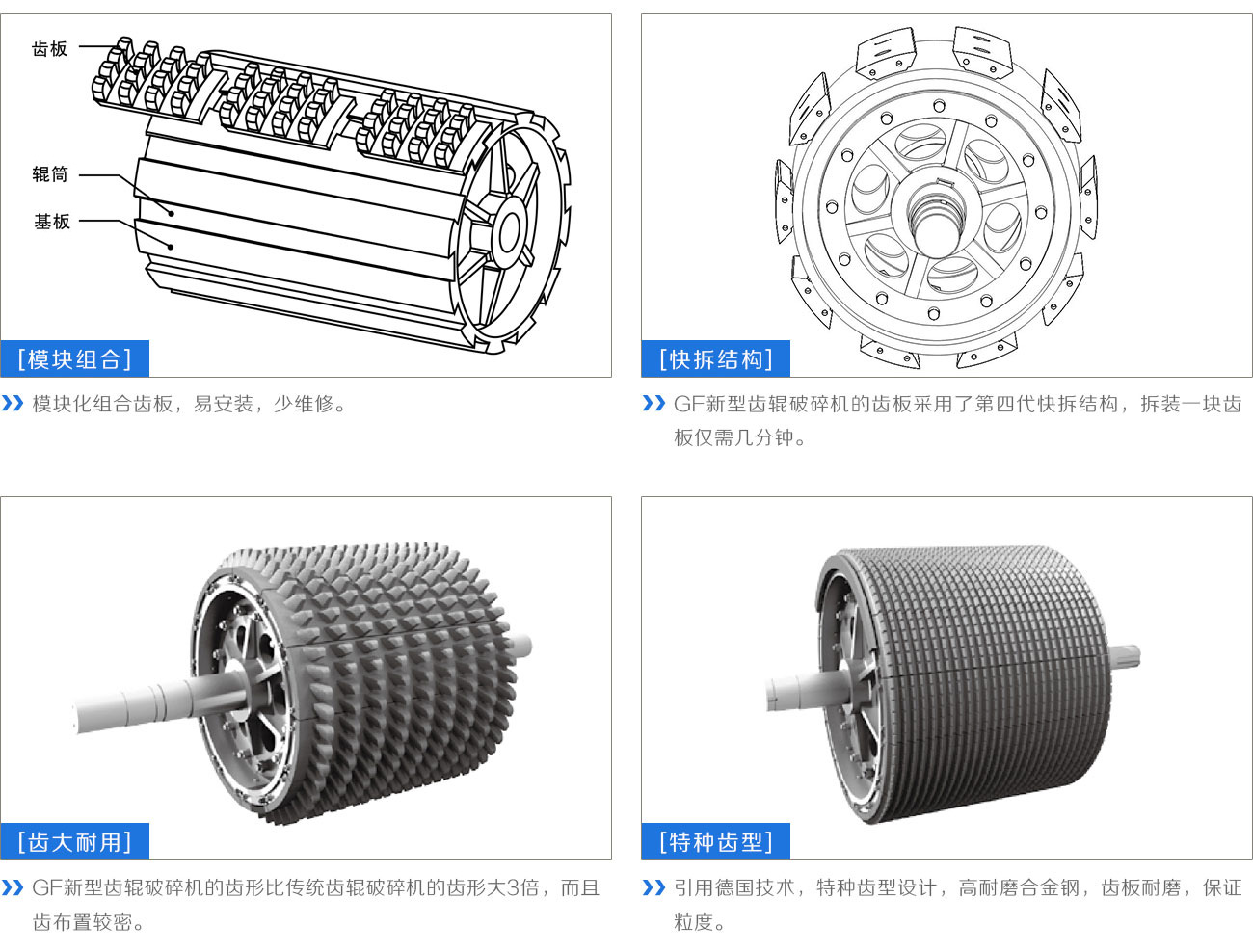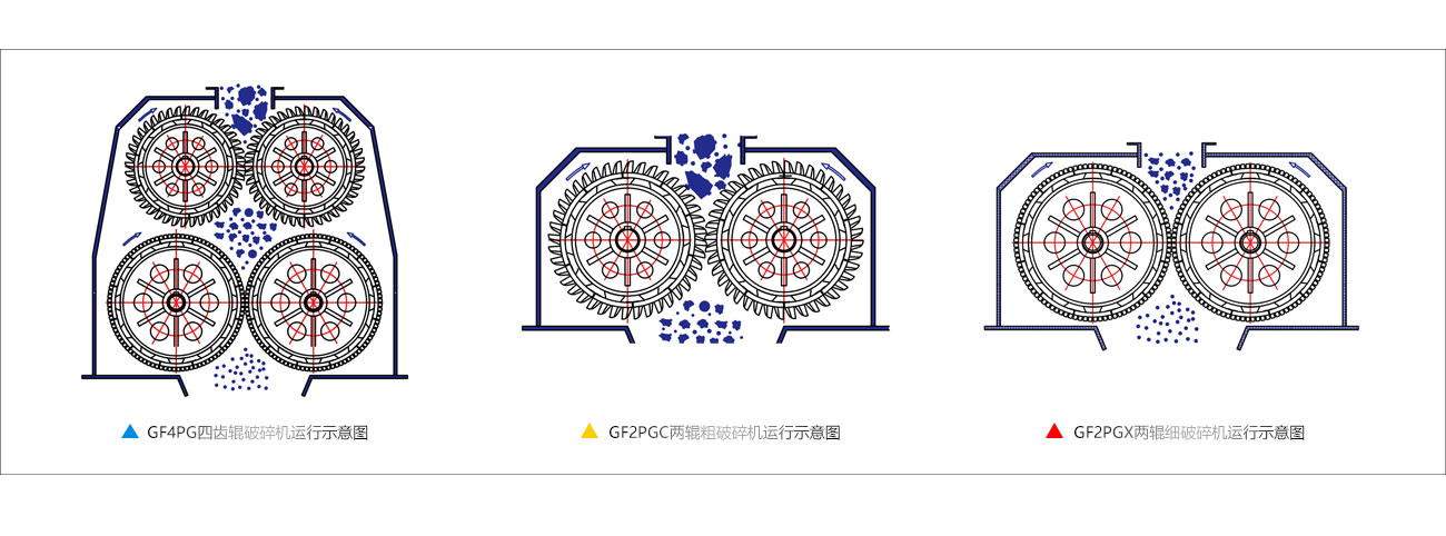 | ?篩、破一機投資?。簝升X輥相對轉(zhuǎn)動形成了旋轉(zhuǎn)的空間格篩。達(dá)到破碎、篩分的雙重功能,一機即完成破碎篩分作業(yè)。故不需配備篩分設(shè)備,簡化系統(tǒng),減少投資。 | ?GF4PG四齒輥破碎機結(jié)構(gòu)簡單檢修少:手輪或液壓結(jié)構(gòu)可迅速調(diào)整出料粒度。設(shè)備模塊化構(gòu)架,根據(jù)現(xiàn)場需要可分體異地安裝,也可組合安裝,便于起吊和檢修。標(biāo)準(zhǔn)化模塊組合齒板具有互換性,通用性,降低齒板的更換周期,降低運行成本。 | |