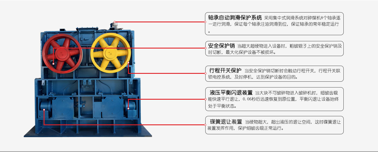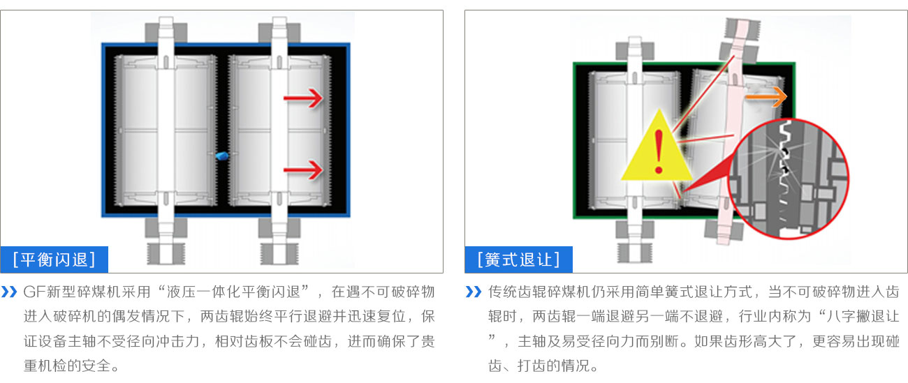 | ?環(huán)保節(jié)能效率高:進料≤300mm,出料≤10mm可調(diào),一次破碎比可達(dá)50。GF破碎機能耗具有儲備和釋放動能的作用。相比同等出力錘式破碎機能耗只有不到1/2,經(jīng)濟效益非常可觀。小于0.3mm的振幅,低于70分貝的噪音,微正壓全密封的結(jié)構(gòu)形式,工作現(xiàn)場的“三害”現(xiàn)象降低,減少了職工矽肺病的發(fā)生,是一款符合環(huán)保標(biāo)準(zhǔn)的產(chǎn)品。 | 液簧平衡閃退保護:采用創(chuàng)新齒形,工作部件齒板采用燕尾連接結(jié)構(gòu),連接可靠。我公司針對客戶煤種來源不固定,雜物較多的情況開發(fā)了自動退讓式破碎機產(chǎn)品。當(dāng)木塊及其它非磁性合金或橡膠等柔性物體進入破碎機無法破碎時,兩齒輥能自動平行退讓開上述物料,隨后又迅速恢復(fù)到原調(diào)好的間隙位置,使設(shè)備連續(xù)運行。 | |