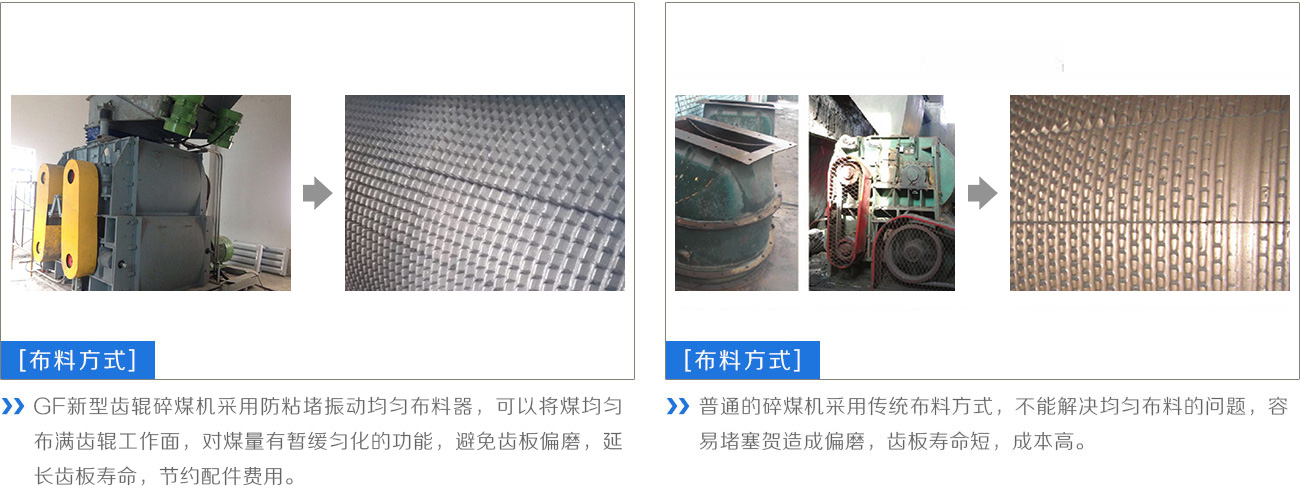 | ?GF4PG四齒輥破碎機運行平穩(wěn)、智能、可靠:整機采用電氣和機械雙重保護,電控柜配有PLC可編程控制器,具有聯(lián)鎖保護功能,可實現(xiàn)就地控制和集控室手動/自動控制。是供熱、供電行業(yè)的理想破碎機。 | ?振動給煤,均勻布料:選用我公司新型防粘堵振動均勻布料器,降低齒板偏磨,延長齒板壽命。 |